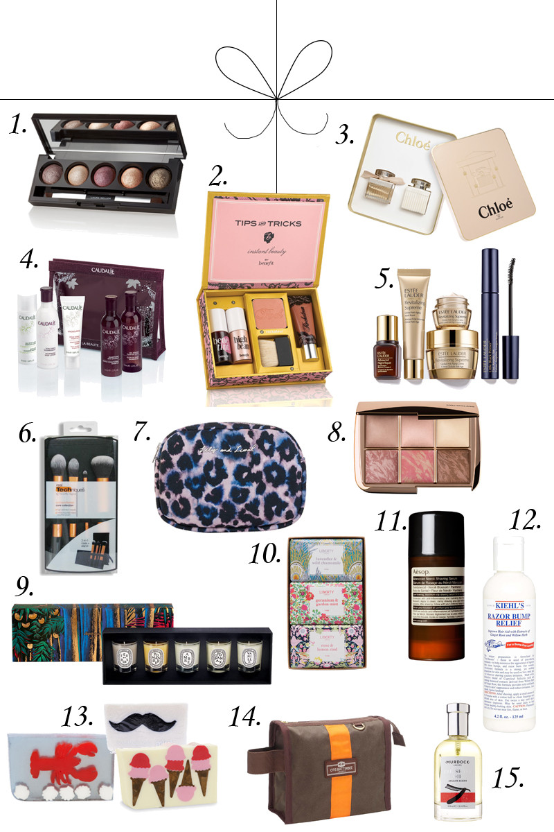 1. Laura Geller Baked Eye Shadow Palette | 2. Benefit Rockitude Lip & Cheek Kit | 3. Chloe Eau De Perfum 50ml Gift Set | 4. Caudalie Christmas Essentials Gift Set | 5. Estee Lauder The Ultimate Starter Set | 6. Real Techniques Core Collection Kit | 7. Make Up Bag | 8. Hourglass Ambient Lighting Edit | 9. Diptyque Mini Candle Set | 10. Liberty Trio Soap Set | 11. Aesop Shaving Serum | 12. Razor Bump Relief Cream | 13. Soaps (Lobster, Moustache, Ice cream) | 14. Waxed Wash Bag | 15. Murdock Pre Shaving Oil