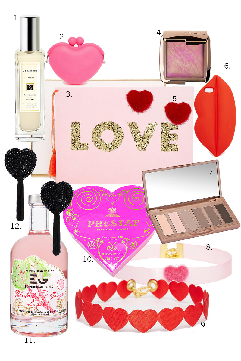 1. Jo Malone - Pomegranite Noir | 2. Jelly Heart Purse | 3. LOVE Card | 4. Hourglass Ambient Lighting Blush | 5. Fluffy Heart Earrings | 6. Lips Phone Cover | 7. Naked2 Basics Palette | 8. Pink Fluffy Choker | 9. Red Heart Choker | 10. Prestat Chocolates | 11. Rhubarb and Ginger Liqueur | 12. Nipple Tassels